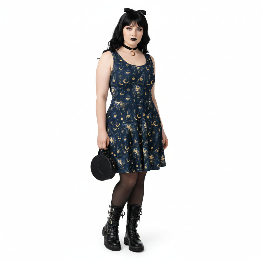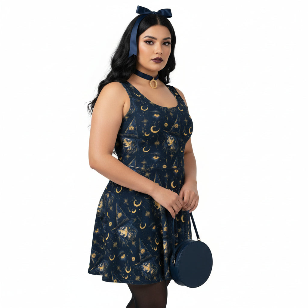 Embrace the enchanting whimsigoth trend with this stunning celestial dress that is capturing attention on social media and search platforms. This fit and flare dress is a perfect blend of gothic and witchy aesthetics, designed to make a statement wherever you go. The dark navy fabric is adorned with a captivating moon, stars, and witch pattern that aligns with the growing interest in celestial and occult fashion.